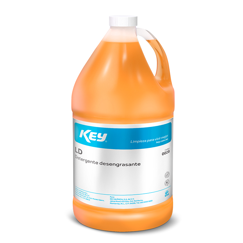Detergente líquido desengrasante biodegradable de alto poder. KEY LD humedece, penetra y reacciona con la grasa, aceite y suciedad formando una emulsión fácilmente enjuagable, dejando la superficie completamente limpia de forma inmediata. No deja residuos aceitosos, no es tóxico, ni corrosivo, no es inflamable, no contiene abrasivos, es un limpiador ecológicamente seguro.
